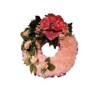 A beautiful artificial silk funeral memorial flower wreath which is made with pink ribbon edge and has a base of pink silk carnations with matching flower cluster.