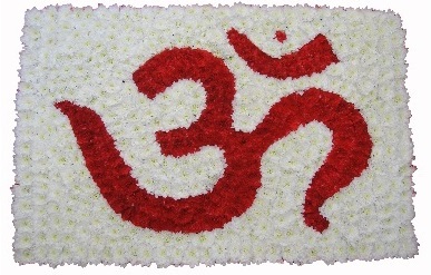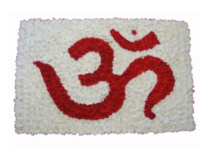 AUM symbol, made on a large base with Chrysanthemum. with red ribbon trimming.