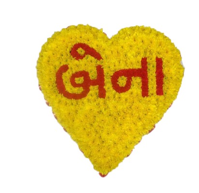 A heart made of yellow chrysants with 'Benna' written in red at the centre.