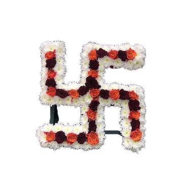 A handcrafted Swastik symbol made with roses and a border of white chrysants.