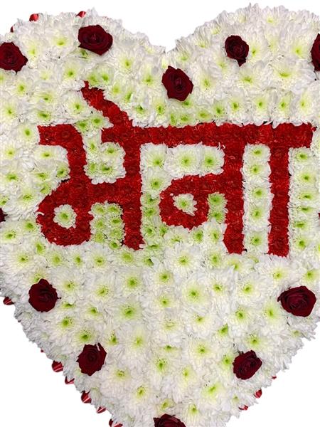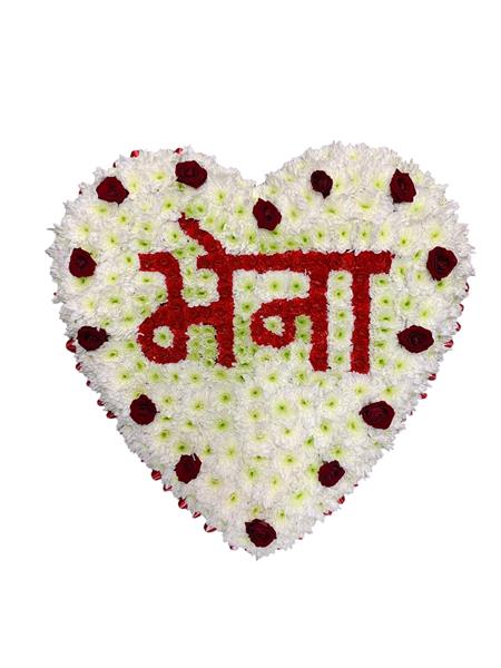 A Beautiful 21" heart made with white and dyed chrysanthemums
