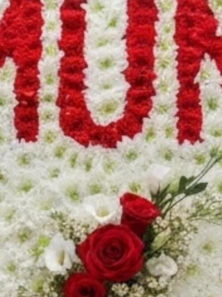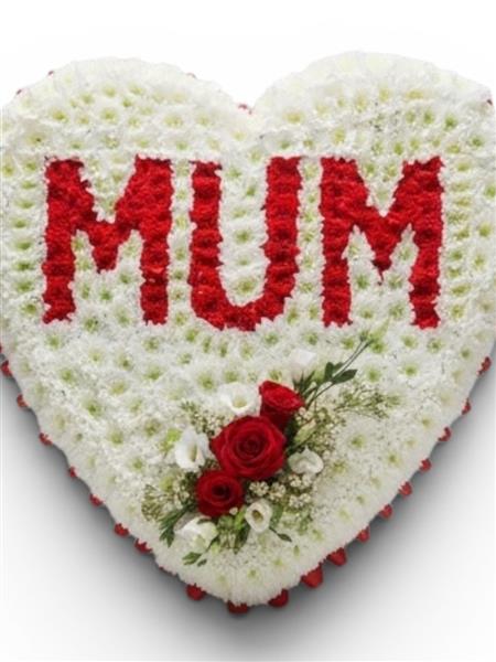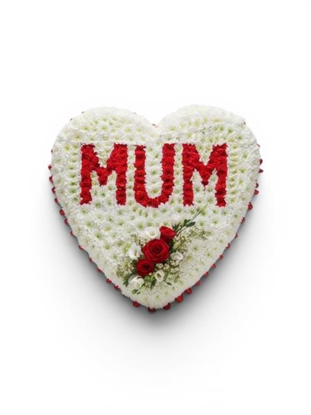 A beautiful heart with MUM letters, set on a red & white heart-shaped floral foam oasis base with chrysanthemums, sprayed with colours. edged with Ribbon trimming.