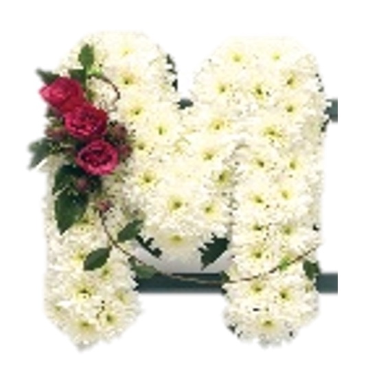 White Chrysanthemum based letters on stand with spray roses and complementary foliage edge.