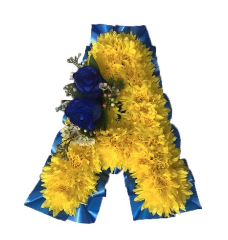 • Made with a chrysant base, with a small arrangement finished with Ribbon trimming, Available in any name or relation in floral letters A to Z or 1 to 0 (maximum 8 character per tribute)Please select the ribbon colour then select Word or Name required.