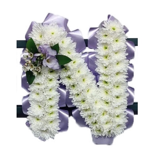 Made with a chrysant base, with a small arrangement finished with green foilage, Available in any name or relation in floral letters A to Z or 1 to 0 (maximum 8 character per tribute)
