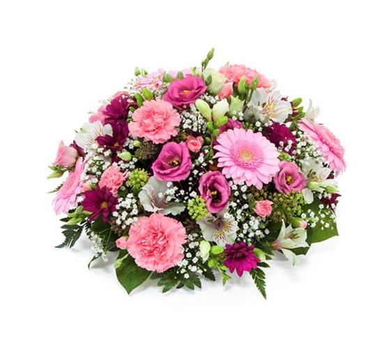 A floral posy pad trimmed with greenery, Choose from a range of sizes, and variety of flowers and colours.
