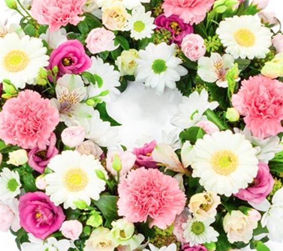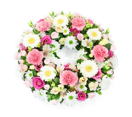A beautifully made pink & white wreath containing white germini, pink carnations, pink lisianthus, white alstroemeria, white chrysanthemums and pink spray carnations.
