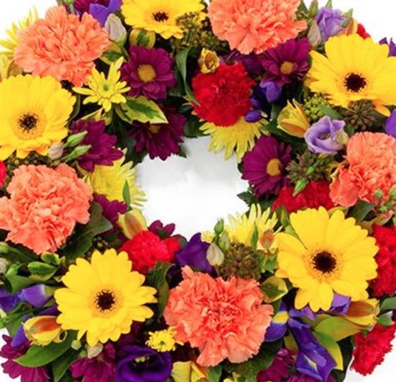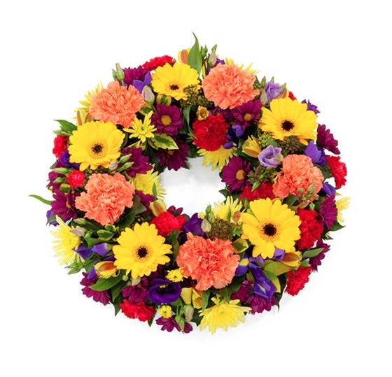 A bright and vibrant wreath put together using yellow germini, yellow spider chrysanthemum, orange alstroemeria, iris, purple lisianthus and cerise spray carnations.