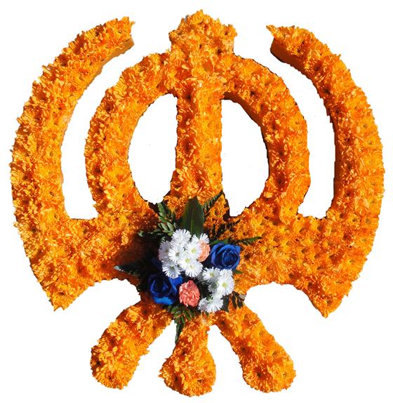 Khanda is known as the Sikh National anthem, as the emblem of the Khalsa. Khanda cut out made on Oasis floral foam base with chrysanthemums.