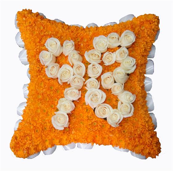 A Symbol of Sikhism Ek Omkar is made on a Cushion Shape Oasis floral foam base with chrysanthemums And Roses with ribbon trimming.