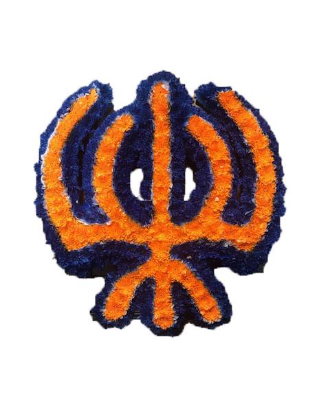 A thoughtfully handcrafted orange Khanda made with a dark blue border of chrysants.