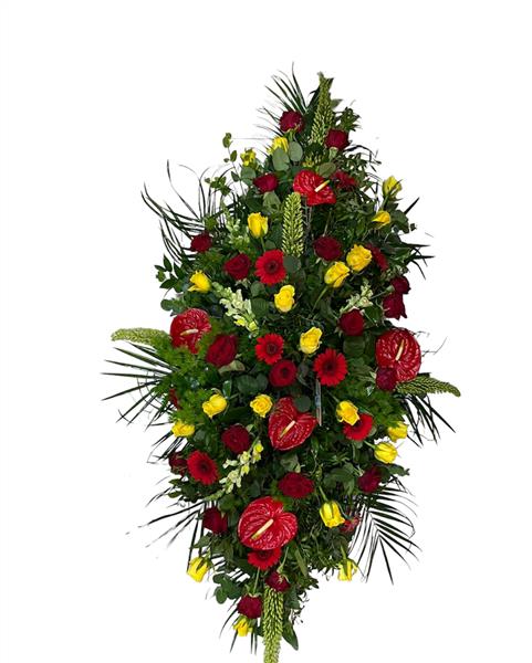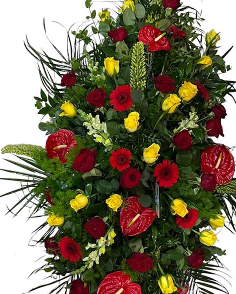 with lush tropical greens on a wire easel, this standing spray will make a truly beautiful addition to the service.