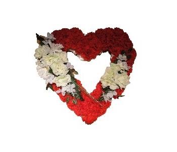 A classic open heart design, created in the traditional way, using a massed carnation base and a colourful spray of roses and greenery.