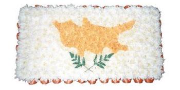 A Cyprus flag made on large oasis floral foam base with double spray chrysanthemums and spray with colour and trimmed with ribbon.