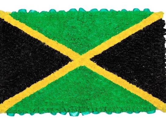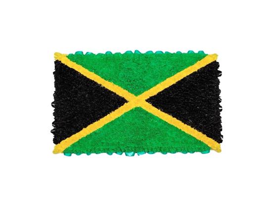 A Jamaica flag made on large oasis floral foam base with double spray chrysanthemums and spray with colour and trimmed with ribbon.