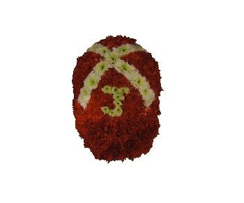 Cut to the shape of 3d cap. Made with a Chrysant base and finished with ribbon.