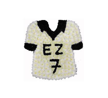 A BLACK AND WHITE FOOTBALL SHIRT SHAPED TRIBUTE. BLACK AND WHITE SPRAY CHRYSANTHEMUMS, WITH TEXT OF YOUR CHOICE ENGRAVED IN THE MIDDLE.