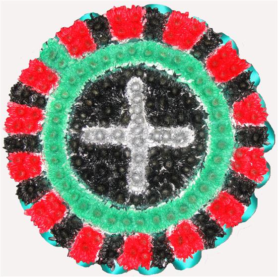 A beautiful Roulette tribute made on large round oasis floral foam base with double spray chrysanthemums and spray with colour and finished with ribbon trimming.