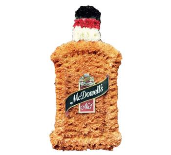 A Whisky Bottle Cut Out Made on floral foam oasis base with chrysanthemums and spray with colour and finished with ribbon trimming to give a beautiful look.