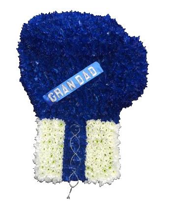 A tribute of boxing glove made on a large Oasis floral foam base with chrysanthemums and spray with colours. And finished with ribbon trimming.