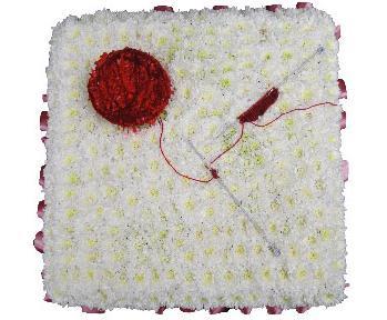 A Knitting tribute made on large oasis floral foam base with double spray chrysanthemums trimmed with ribbon.