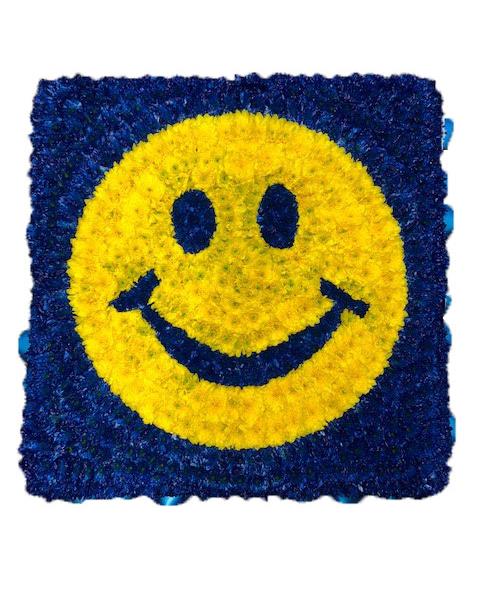 Smiley Face Logo Cut to the shape of your choice. Made with a Chrysant base and finished with ribbon.