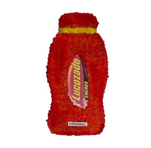 Cut to the shape of Lucozade bottle of your choice. Made with a Chrysant base and finished with ribbon.