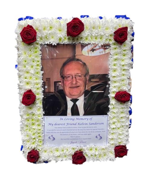 This very personal floral tribute features a photo of your loved one surrounded by a frame of fresh flowers. An abundance of white double spray chrysanthemums are contrasted with red short Stem roses finished with ribbon