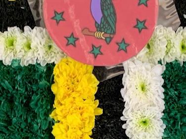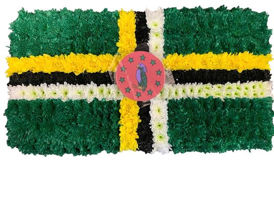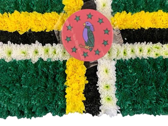A Dominica flag made on a large oasis floral foam base with double spray chrysanthemums and spray with colour and trimmed with ribbon.