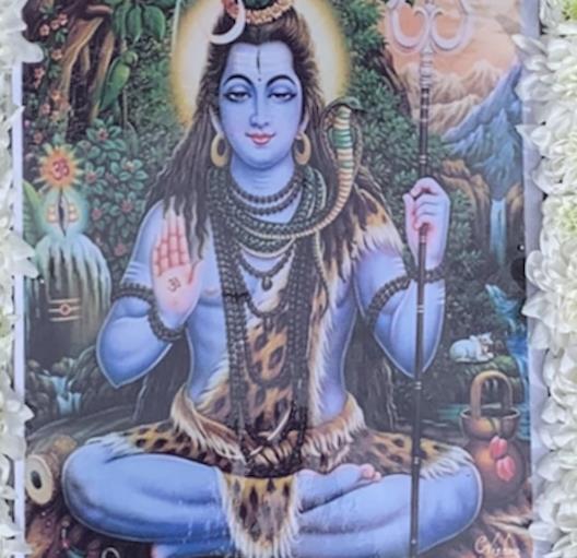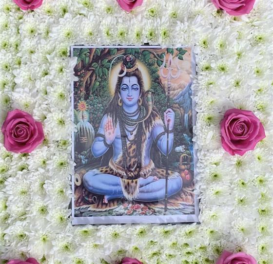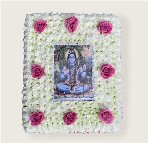 This floral tribute features a photo of Lord Shiva surrounded by a frame of fresh flowers. An abundance of white double spray chrysanthemums are contrasted with red short Stem roses finished with ribbon