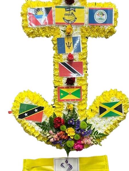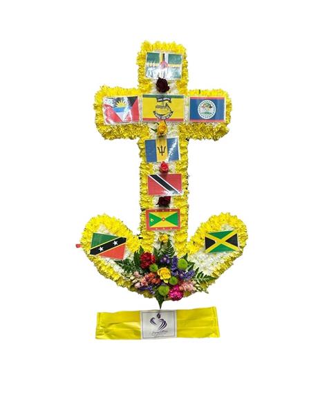 A yellow Chrysanthemum-based anchor tribute with a spray of vibrant flowers. Also, the United Countries flag has been arranged on request with or without a stand.
