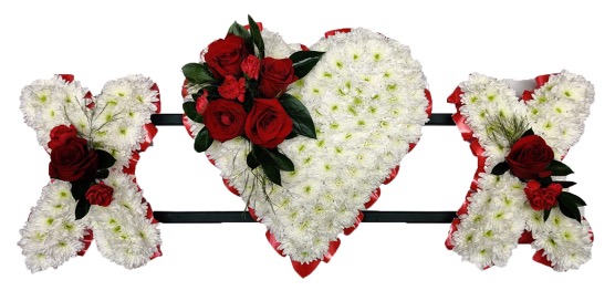 A white heart made of chrysants at the centre of two Xs, each of them with a small rose arrangement.