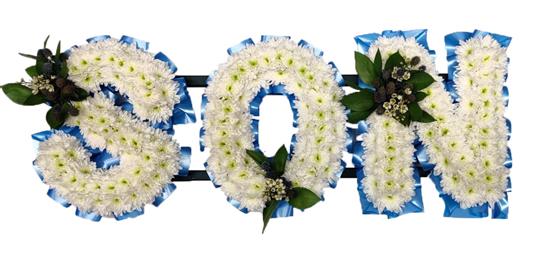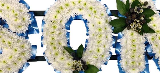 White Chrysanthemum based letters on stand with spray roses and complementary foliage edge.