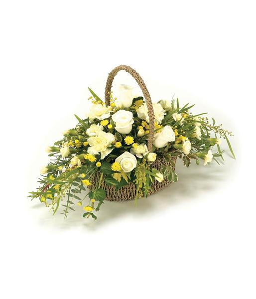 A delightful Sea grass basket arrangement containing white Roses & Carnations together with yellow Chrysanthemums & Mimosa.