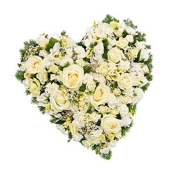 A classic white Rose and Hydrangea heart with Carnations and cream Lisianthus.