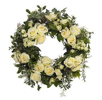 A beautiful white Rose and Jasmine wreath with a generous mix of foliage.