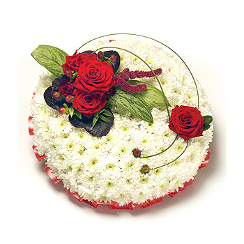A white Chrysanthemum based posy with red ribbon edging, complete with red & green flower spray including Roses, Amaranthus & Hypericum.