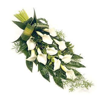 A classic and natural sheaf of Calla Lilies and complementary foliage tied with a natural bow. Size: 64cm (25").