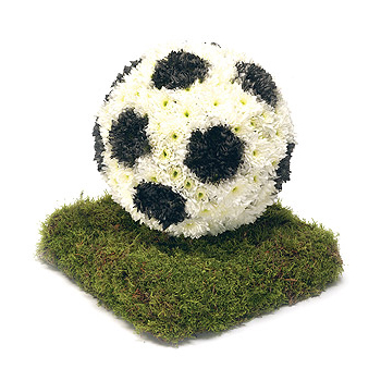 Based Chrysanthemum wreath in the shape of a football on turf. Size: Base - 30cm (11") Height - 33cm (13").