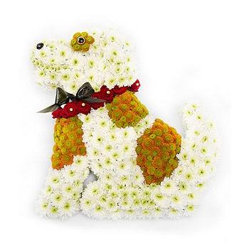 An adorable sitting dog tribute. White and bronze Chrysanthemums form the base of this design which is perfectly finished with a red Rose collar.